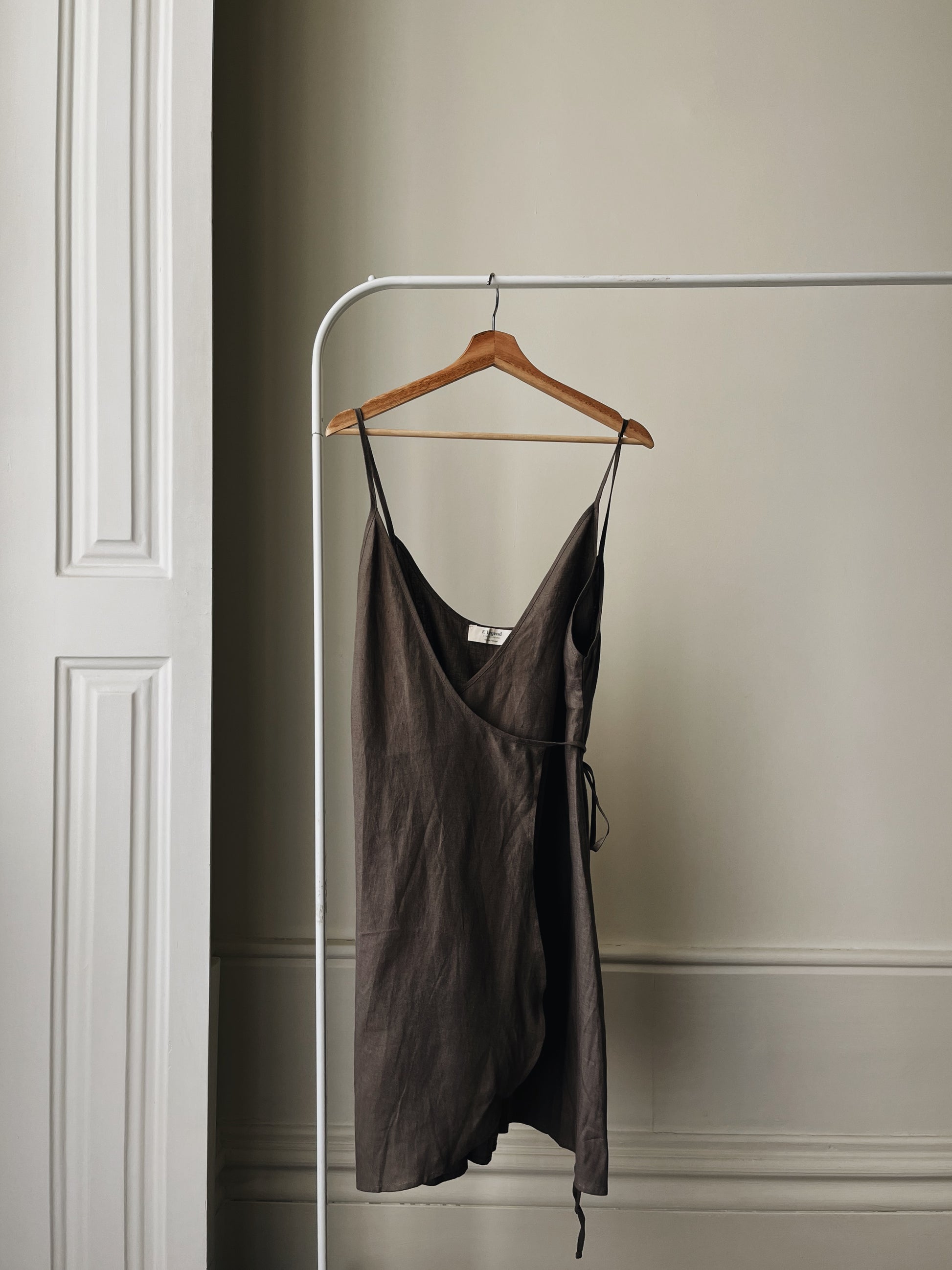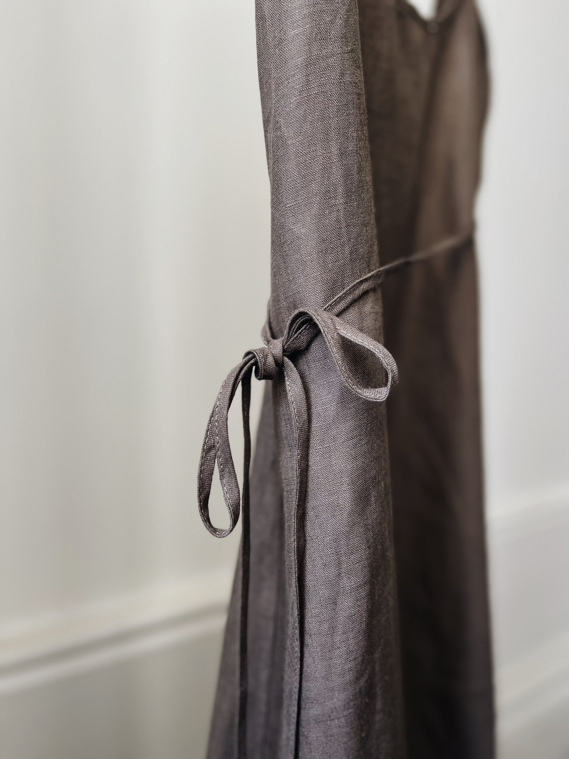 Dark grey linen dress with a wrap closure, allowing for a knot at the front, back or side.