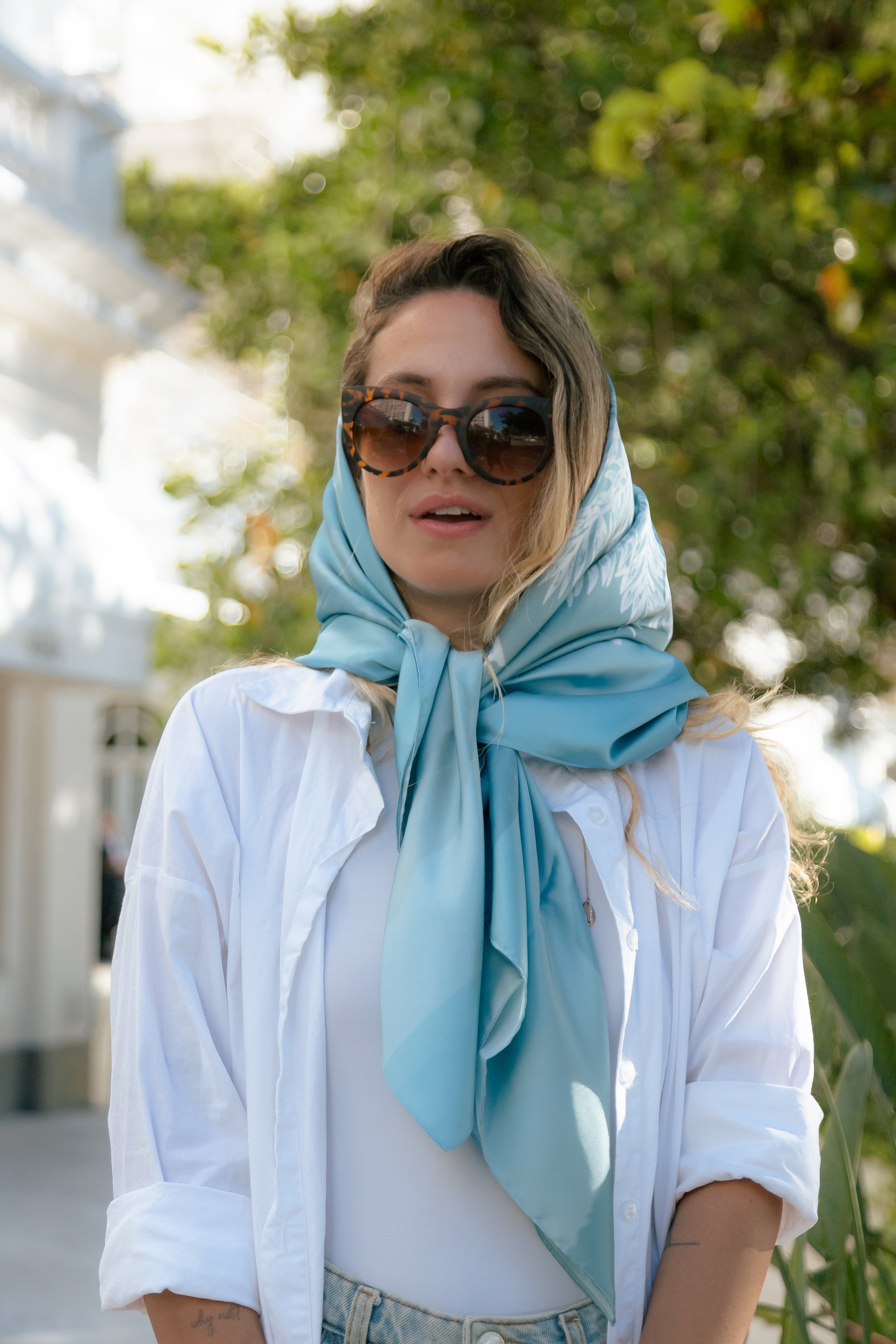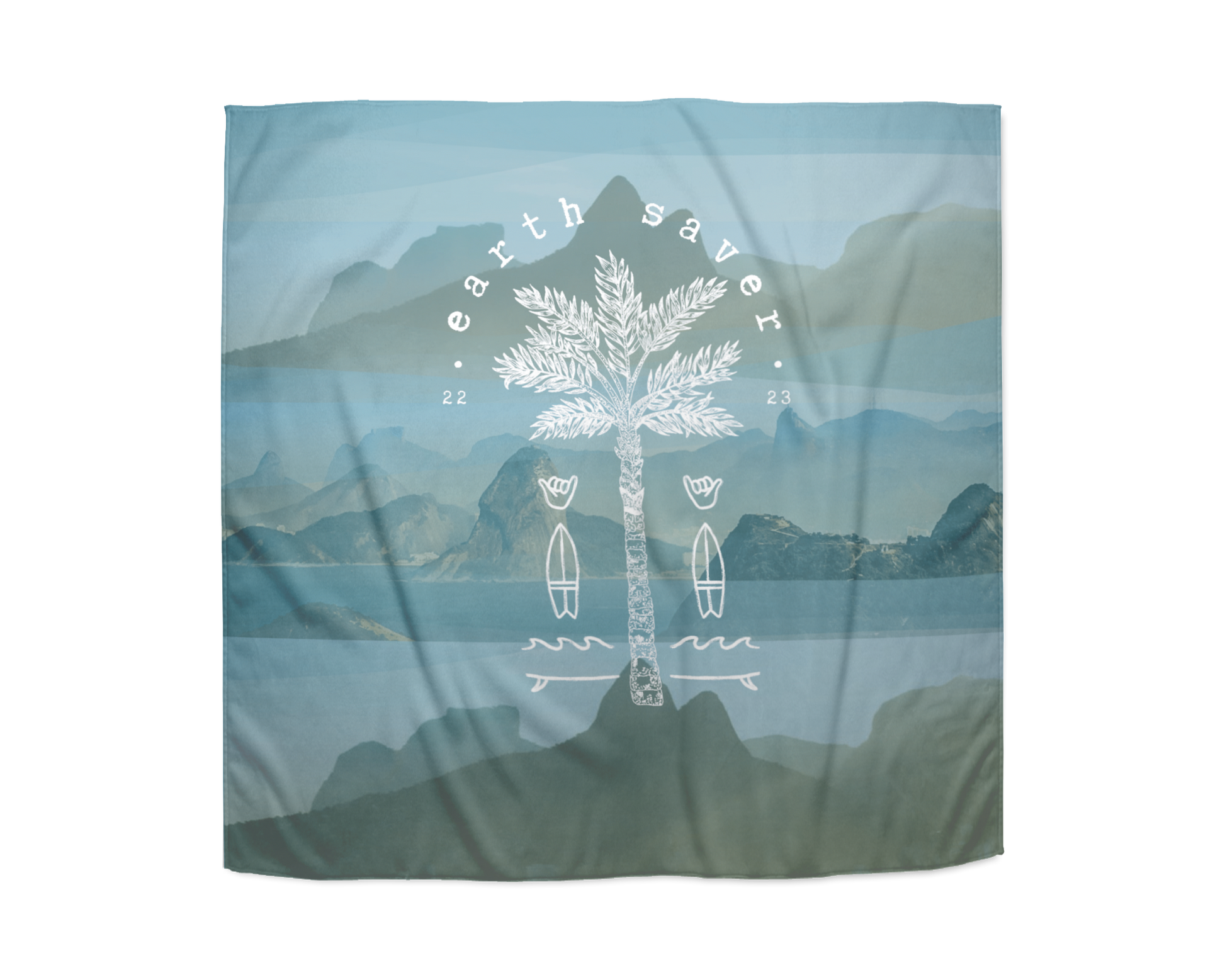 This scarf in various tones of blue has in its landscape elements such as mountains and the sea, projecting strength and calm at the same time. making us to reflect in the beauty of the mother nature. Designed by hand are also surfboards which suggest a relaxed fun free spirit. A palm tree can also be seen in the center. All these elements together reinforce the idea that the sea is a paradisiacal place and that we should take care of it.