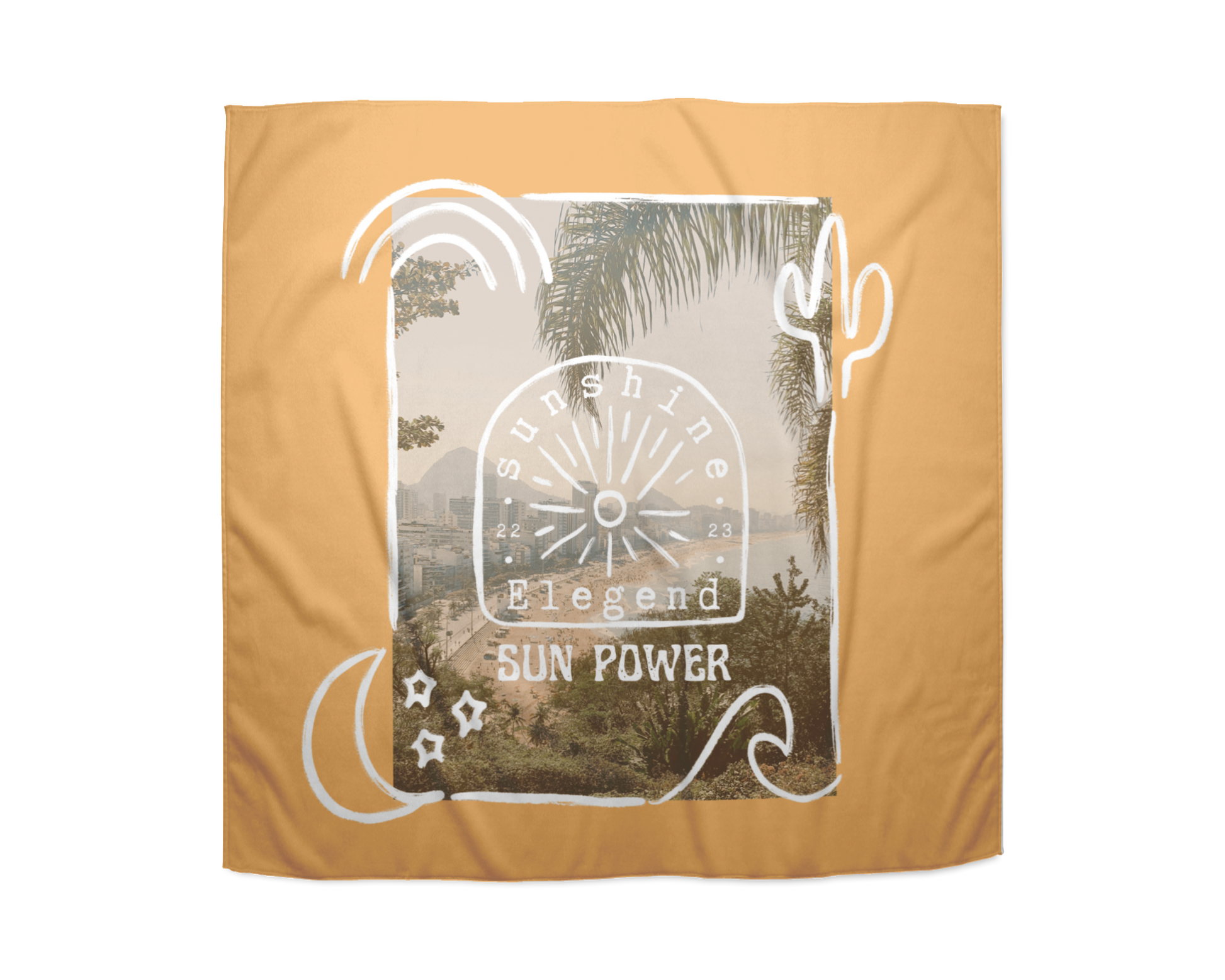 O lenço com uma cor salmão misturada com a cor de areia é confecionado em tecido de cetim 100% reciclado pós-consumo. A peça possui um estampado no centro que remete para aqueles dias solarengos passados a disfrutar na praia de Ipanema, na considerada cidade mais bonita do mundo : “O Rio de Janeiro continua lindo!”